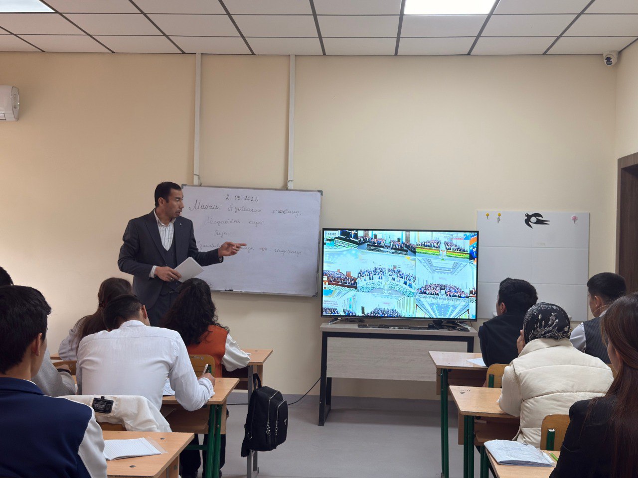 Bugun Sirdaryo yuridik texnikumida Prezidentimiz Shavkat Mirziyoyevning 2026-yil 24-fevral kuni yoshlar bilan o‘tkazgan uchrashuvida ilgari surilgan 32 ta muhim tashabbus mazmuniga bag‘ishlangan “Kelajak soati” ma’naviy-ma’rifiy tadbiri tashkil etildi.